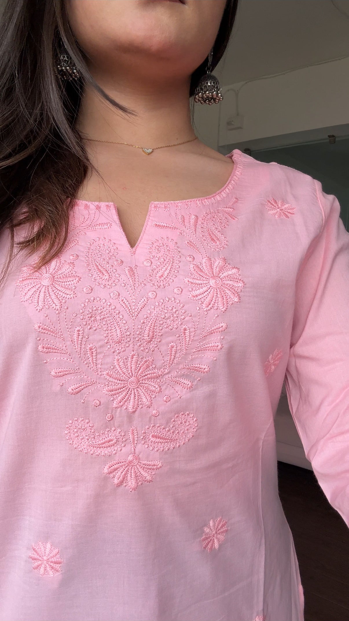 Timeless Lucknowi charm meets modern style. This solid-color short kurti features delicate Chikankari embroidery, perfect for effortless elegance in everyday wear or casual outings.