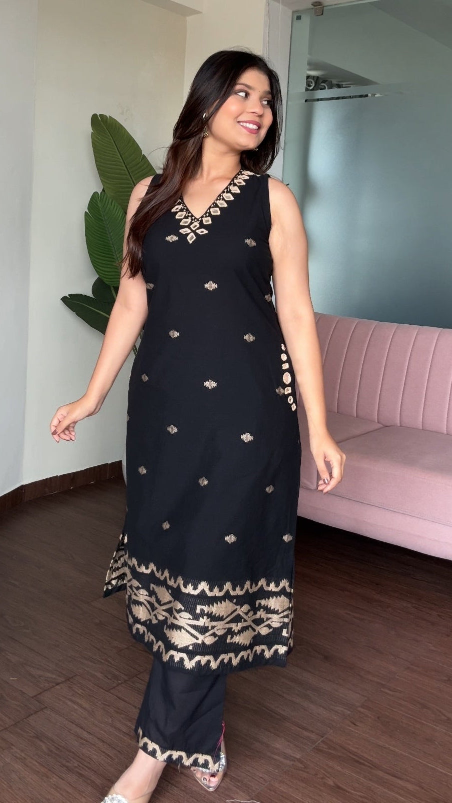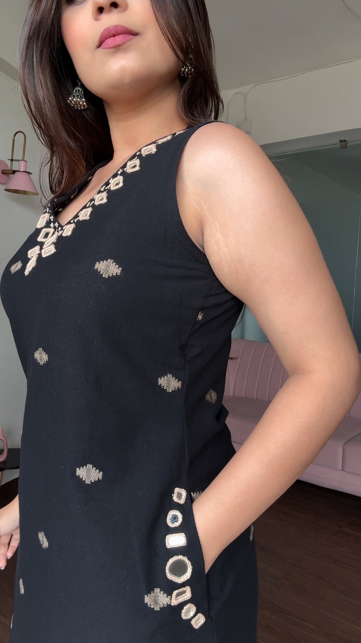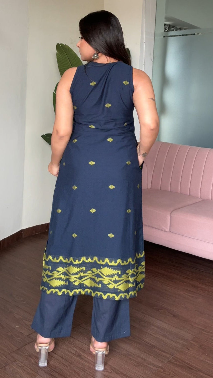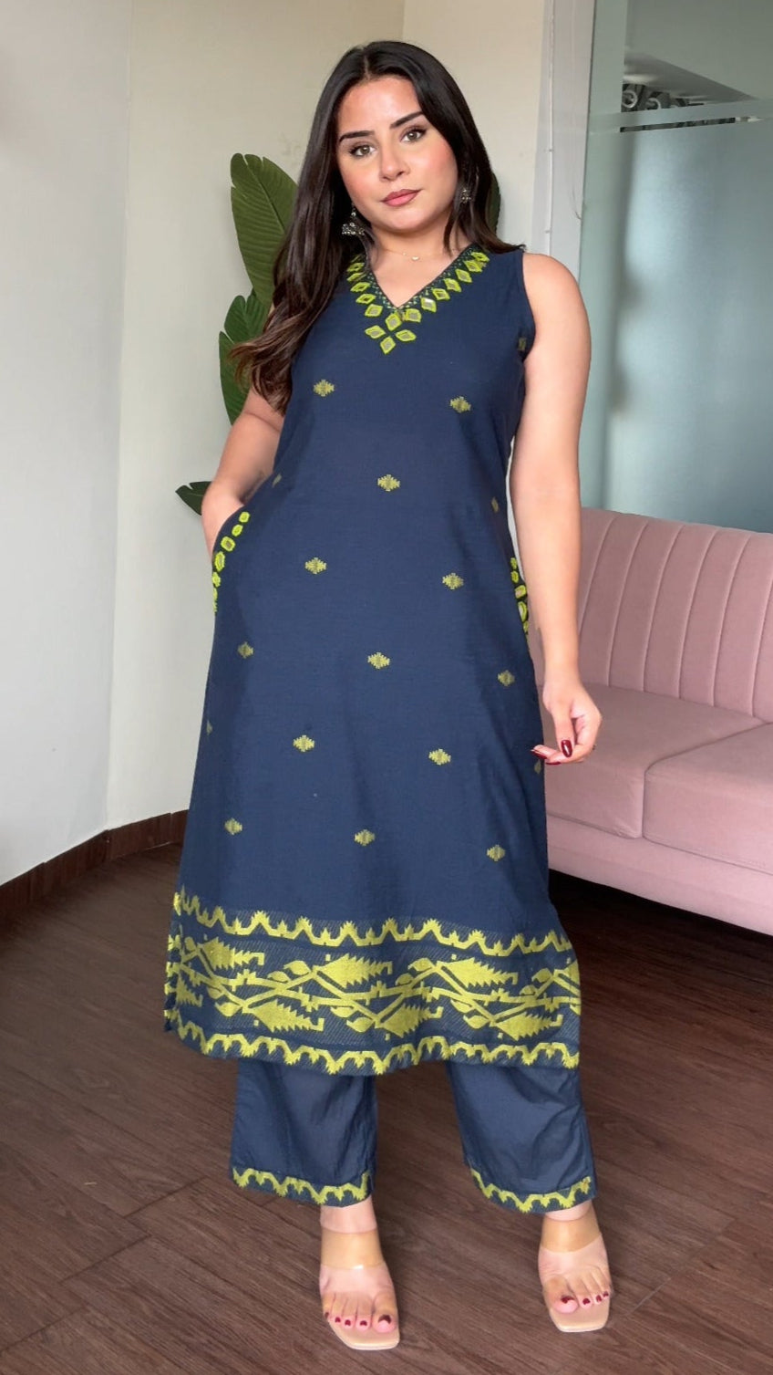 Vibrant and eye-catching, this cotton kurta set features bold colour blocking with intricate mirror work for that perfect festive sparkle. Comfortable, stylish, and unapologetically desi.
